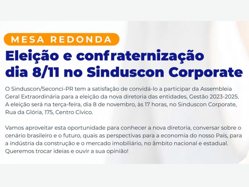 Mesa redonda: Eleição e confraternização dia 8/11 no Sinduscon Corporate às 17h